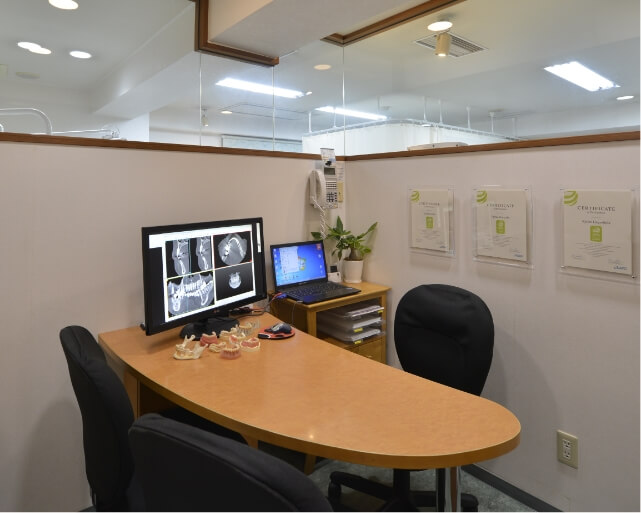 - プライバシーを確保したカウンセリングルームを完備しております。お口の状態の分析結果、CT画像の診断内容、必要な治療とその選択肢などをご説明するのはもちろん、患者様の治療に対するご不安や問題など様々なことをお伺いし、じっくりと丁寧にご納得いくまで説明致します。