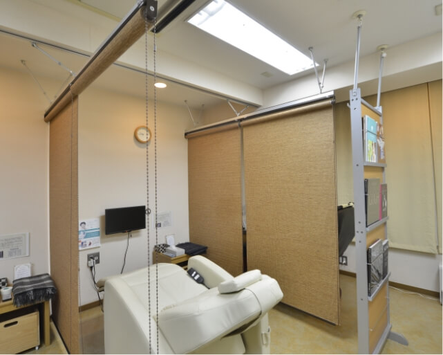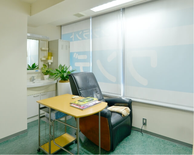 - 治療と治療の合間を患者さまにリラックスして待機していただくためのリカバリールームです。TVや雑誌類完備の半個室になっており、ゆったりとくつろいでいただくことができます。