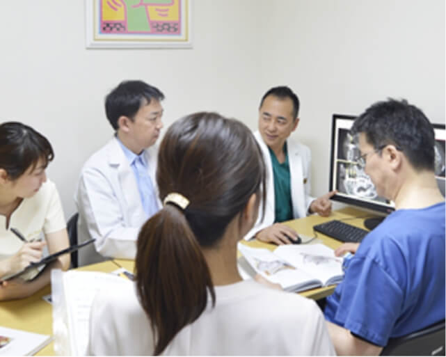 一人の医師に検査や診断、治療を集中させるのではなく、各分野最高水準のプロフェッショナルがチーム体制で一人の患者さまの治療に臨むことによって、医師の個人的な判断に陥ることなく、各分野からの意見を総合して患者さまの治療にあたることができます。これにより、高水準の治療が標準化されるだけでなく、あってはならない医療事故の可能性を極限まで下げることを目標としています。